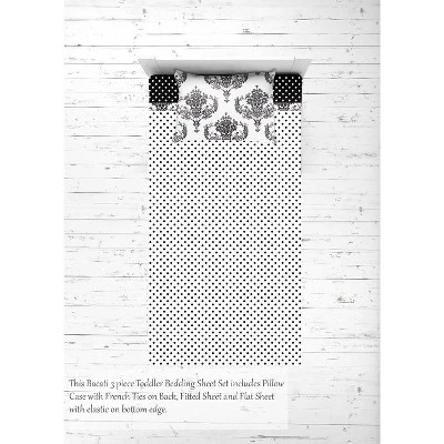 - This Bacati 3-piece Toddler Sheet Set Includes Toddler Bed Fitted Sheet(52 x 28 x 6 inches), Toddler Bed Flat Sheet(52 x 42 inches) which is fitted at the bottom to make the bed easily and Standard Pillow Case (20 x 25 inches) with rench ties on the back in fun, colorful and signature prints in 100 percent cotton 200 Thread Count percale fabrics. Designed in United States by Experienced Designers. Many coordinating items available to purchase separately in this Bacati Classic Damask Black/Grey/White Bedding Collection.