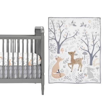 This 3-piece baby bedding crib set includes one quilt (35” X 44”), one fitted crib sheet (28” X 52”), and one crib skirt (dust ruffle) (51” X 27”). Designed in soft shades of gray, hazelnut and tan this enchanting forest is filled with trees, birds, mushrooms, a soft tan velour appliqued deer, a cute gray rabbit, and a mischievous fox. The back of the quilt is a pretty leaf pattern in two tones of gray and mirrors the crib skirt. The fitted crib sheet features all the charming forest animals along with leaves and mushrooms. The crib sheet has elastic all the way around ensuring a safe and secure fit. This collection was made in a soft microfiber fabric and is durable and machine washable.