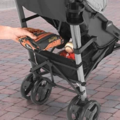 Corso’s one-hand, quick fold design is compact and stands independently without the push handle touching the ground, so you can easily fold it and keep it clean while on the go. If cleaning the stroller becomes necessary, the seat fabrics are removable and machine washable.