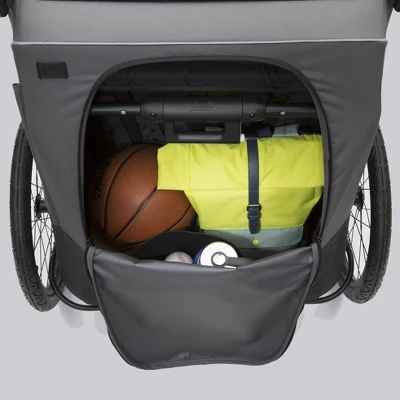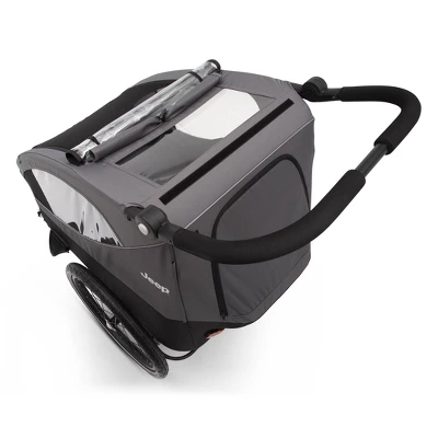 Take the whole family along for any adventure with the Jeep Everest 2-in-1 Bike Trailer and Stroller for 2 Kids by Delta Children. A durable bicycle trailer that easily transforms into a double stroller once you reach your destination, it provides a comfortable ride for two children. The included universal bike hitch easily attaches to most bicycles and the included stroller kit allows you to go from biking to strolling quickly by adding a front wheel. Designed to keep kids comfortable, the trailer features a large front mesh window, roll down rain shield and roll down windows on both side with mesh vents for airflow. An adjustable handlebar provides comfort for parents while in stroller mode and spacious rear cargo storage space can house frisbees, footballs, food—whatever your family needs while on the go. And when your outing is over, the compact, flat fold makes travel and storage easier than ever. For your safety, trailer includes safety flag, reflective piping, and two 5-point safety harnesses.