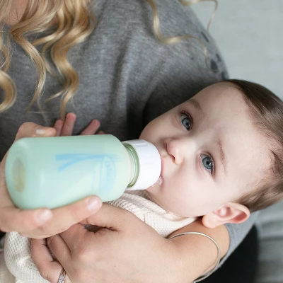 - INCLUDES 100% SILICONE GLASS BOTTLE SLEEVE. 4oz/120mL, with Level 1 Slow Flow Nipple, 2-Pack, 0m+, with Mint Silicone Sleeve. The silicone sleeve protects the bottle while in use, while sterilizing or while in the dishwasher.