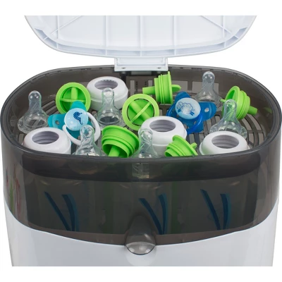 - CONVENIENT ACCESSORY TRAY. Built-in accessory tray holds bottle parts, nipples, pacifiers and more, making it possible to effectively sterilize all your baby’s accessories at once.