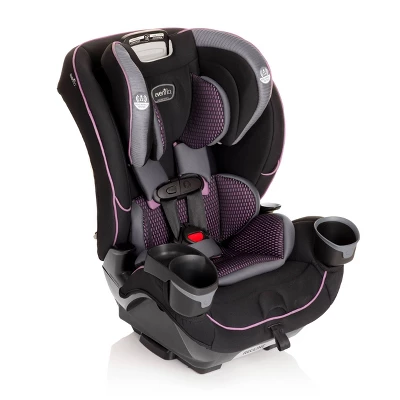 The EveryFit 4-in-1 Convertible Car Seat from Evenflo adjusts and changes to accommodate the needs of your growing child. A rear-facing harness sets up your baby for a safe ride, while a forward-facing harness helps you set up your kiddo for trips in the car when they’re at least two years old. This seat continues to accompany your kiddo as they get older, as the removable back and no-back booster help them sit without the back support. Cup holders and snack trays make it easy to quell hunger spells without making a mess, and further customization helps to suit the needs of your child with a number of reclining positions and headrest positions.