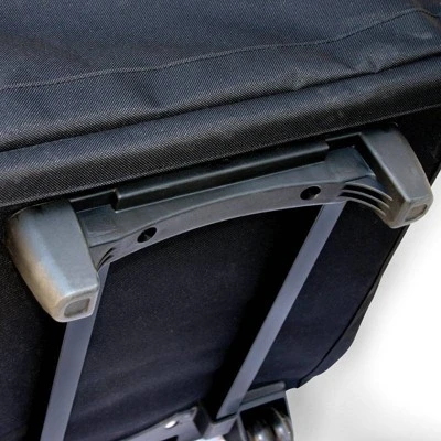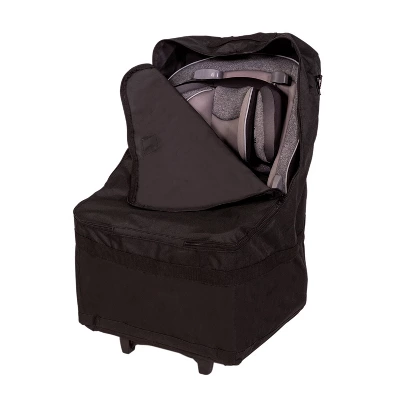 The Wheelie Car Seat Travel Bag makes traveling with kids and their car seats a little easier. This bag protects your child’s car seat from scratches, dirt and germs. It’s easy to use when gate checking a car seat, bringing it on the plane (it folds flat to store in an overhead compartment) or when traveling by train or cruise ship. The Wheelie Car Seat Travel Bag is made of water-resistant, heavy-duty fabric that cleans easily and protects your car seat from moisture and other dirt. It features an adjustable, interior cinch strap to hold your car seat in place, an adjustable pull strap for easy maneuvering, dual rubber wheels, resting pegs and a solid platform to prevent dragging. The dual zippers can be locked. There’s a detachable shoulder strap and clear ID pocket with ID card – perfect for your peace of mind.