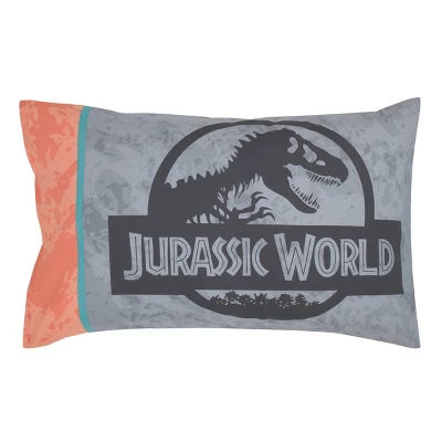 Universal’s Jurassic World Into The Wild 4 Piece Toddler Bed Set includes a comforter, fitted bottom sheet, flat top sheet and reversible pillowcase. The 42″ x 57″ comforter features their iconic T. Rex, Blue the Velociraptor, and a Triceratops. Designed in shades of gray, white, orange and aqua; reverses to an all-over pattern of dinosaurs. The top sheet measures 45″ x 60″ and the bottom fitted sheet measures 28″ x 52″. The fitted bottom sheet features full elastic for a safe and snug fit. Both sheets come in a matching all-over dinosaur print. The 20″ x 30″ reversible pillowcase features the Jurassic World logo on the front and a T. Rex on the back. This set fits a standard toddler/crib size mattress. Made from super soft snuggly fabrics. Machine washable for easy care. The perfect pattern for your little dinosaur tracker!