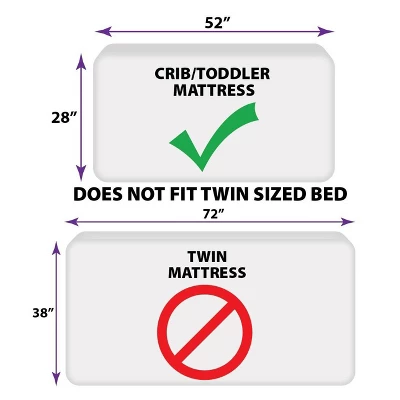 - Fits a standard size toddler/crib mattress measuring 28″ x 52″