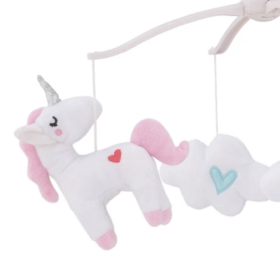 Your little one will drift off to dreamland with this sweet musical mobile. Helps to soothe your baby to sleep with gently spinning 3D plush characters, 2 Unicorns and 2 Puffy Clouds, while playing Brahms Lullaby. Adorable and perfect for any baby’s nursery. Fits onto most standard and convertible cribs. spot clean only.