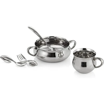 The Nambe Kibo Toddler Flatware Set is a thoughtful gift for any little one ready to join the dining table. The three-piece set fits perfectly in tiny hands, with a fork, spoon, and knife included for your little high-chair graduate. It comes in a felt carrying case with an engravable metal tag, adding a personal touch to the gift. Made with durable stainless steel, this set features Nambe’s signature modern and sleek design. It’s dishwasher safe for easy cleaning and comes in a beautiful gift box, making it an excellent present for baby showers and birthdays.