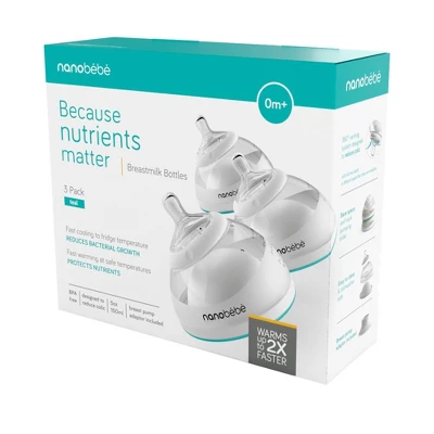 The Nanobebe Breast milk Bottle is the first and only baby bottle designed to preserve essential nutrients in your breast milk during cooling, storing, and warming. This breast milk bottle gives your little one a feeding experience second only to direct breastfeeding itself. Shaped like mom, it helps alleviate nipple confusion, so transitioning between breast and bottle is easier than ever. Quick cooling prevents bacterial growth, while quick warming speeds up prep time without exposing the breast milk to nutrient damaging temperatures. Bacteria multiplies in food quicker the longer it’s stored at room temperature, so it’s beneficial to cool breast milk as quickly as possible so those awesome immunological properties go towards baby’s health rather than fighting bacterial growth. This newborn bottle warms 2x faster than standard bottles so baby is fed and back to bed with less crying time. Bonus: They’re stackable.