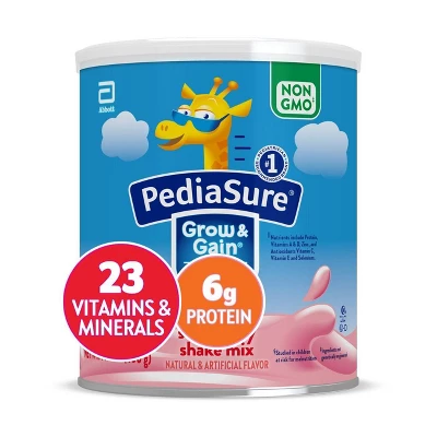 PediaSure Grow & Gain with Immune Support* kids shake mix is clinically proven†to help kids grow. It has 23 essential vitamins & minerals and 7 key nutrients for immune support,* including 6 grams of protein to help build muscles. PediaSure Grow & Gain is non-GMO,‡ gluten-free, has no artificial growth hormones,§ and is suitable for lactose intolerance.|| Just mix with water, add to a recipe or a smoothie, and enjoy. From the #1 pediatrician recommended brand. * Nutrients include protein, vitamins A & D, zinc, and antioxidants (vitamins C & E and selenium). †Studied in children at risk for malnutrition, 2 servings per day. ‡ Ingredients not genetically engineered. § No significant difference has been shown between milk derived from rbST-treated and non-rbST-treated cows. || Not for children with galactosemia.