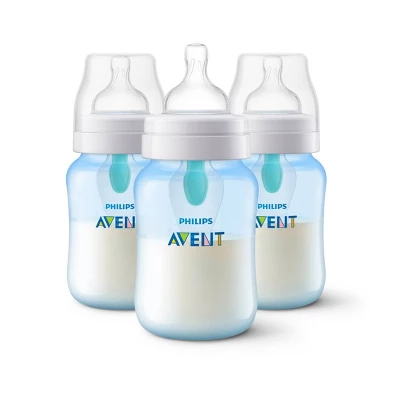 Philips Avent Anti-colic with AirFree vent bottles are designed to reduce feeding issues: such as colic, gas, and reflux. The unique AirFree vent is designed to draw air away from the nipple keeping it full of milk to avoid air ingestion. This vent also keeps the nipple full of milk even when the bottle is held horizontal, allowing for upright feeding. Feeding in an upright position can help to reduce reflux and aid in digestion. The nipple shape is designed for a secure latch for a comfortable feed. The bottle is easy to clean and assemble with few parts. The AirFree vent is only one piece and is easy to clean without any special tools. The Anti-colic bottle features a valve, integrated into the nipple, that reduces vacuum buildup and reducing air into your baby’s tummy. The Anti-colic bottle can be used with or without the AirFree vent, giving you the option based on your baby’s feeding needs. The soft silicone nipple is available in different flow rates for babies of all ages, flows 1-4. We recommend using the Philips Avent Anti-colic baby bottle with Philips Avent Anti-colic bottle nipples. Includes 3 Blue, 9oz, Anti-colic bottles with AirFree vent with Flow 2 nipples. SCY703/23
