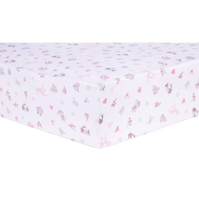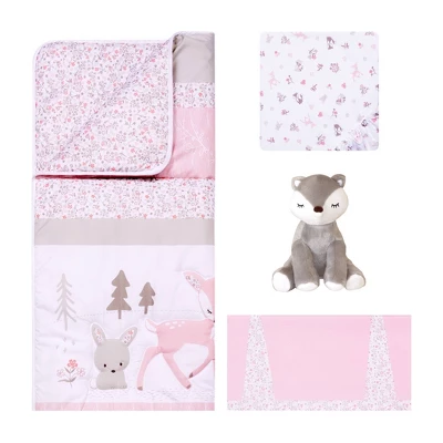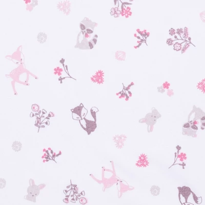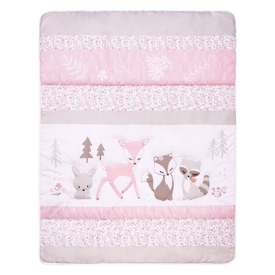 Surround your little one with adorable forest friends with the Sweet Forest Friends collection by Sammy and Lou. A deer, fox, raccoon and bunny stroll through the forest and are accented with a mini floral print and a soft woodgrain print in a girly color palette of light pinks and grays. The nursery quilt is a great 2-in-1 option and can be used as a blanket or a playmat for tummy time. Please adhere to JPMA’s Safe Infant Bedding Practices.