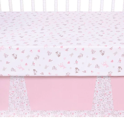 - Set includes nursery quilt, fitted crib sheet, crib skirt, and plush toy