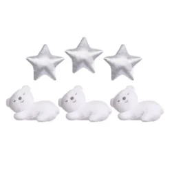 Encourage eye tracking and sound perception skills with this Bearly Dreaming Round Musical Mobile by Sammy and Lou. A gray and white moon and star printed banded mobile ring features two sleeping bears and two gray plush stars suspended from decorative white ribbons that slowly rotate to Brahms’ Lullaby. Mobile fits standard crib rail up to 2.75 inches and measures approximately 24 in tall by 20 in wide when fully assembled.