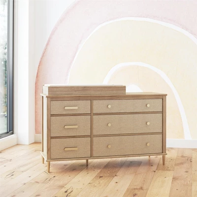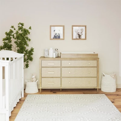 Your little wildflower will love basking in the warm beachy glow of calm coastal tones with the Little Seeds Shiloh collection. This boho-chic collection features engineered wood frames laminated in a natural earthy woodgrain finish coupled with slightly textured faux rattan drawer fronts. The creamy gold tapered feet and hardware add a touch of glam while capturing the essence of vintage elegance. Get the look of a curated design in one convenient dresser with an asymmetrical drawer arrangement and 2 unique styles of complimentary drawer pulls. Truly make their space shine by accenting your little one’s room in pastel color palettes like blush pink, light blue, pea green, and sunshine yellow. The Little Seeds Shiloh 6 Drawer Changing table provides plenty of storage space for your child’s nursery or playroom, complete with durable metal drawer slides and built-in stops for safety. The changing table topper fits a standard size changing pad (not included). Once your little one outgrows the changing table, simply remove the topper to convert to a kids’ dresser. The kids’ Changing Table meets or exceeds the CPSIA Juvenile testing requirements and includes a wall anchor kit to ensure your child’s safety. Little Seeds offers this and many more on-trend baby to teen furniture pieces, and partners with various environmental protection programs to protect pollinator and other wildlife habitats for future generations. Bonus Tip: Natural and synthetic rattan can create thousands of tiny catch-all, hard-to-clean spaces for dust and other contaminants to hide. The Little Seeds Shiloh collection uses a faux rattan laminate that not only makes it a snap to keep clean and sanitary but also discretely keeps the contents of the dresser out of sight. Assembly required. Two adults recommended to assemble. Once assembled, the Changing Table measures to be 53.54″ W x 19.09″ D x 35.31″ H.