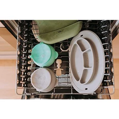- Take the fuss out of your toddler dinnerware set cleaning! Place your silicone bibs, baby spoons, toddler bowl and plate placemat in the dishwasher to keep them clean, stain-free, and sanitary until the next use.