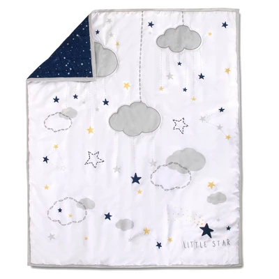 - Reversible quilt has blue sky with stars on 1 side, white backing with stars and the words “Little Star” on opposite; measures 37” x 44” and is 100% cotton with 100% polyester (exc. of design)